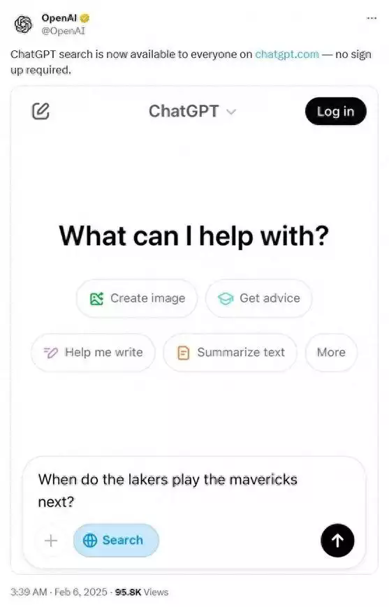 2025 年 2 月 6 日凌晨 3 點(diǎn),OpenAI 宣布向所有用戶開放 ChatGPT 搜索功能,且無需注冊。這一舉措可能對谷歌等傳統(tǒng)搜索引擎造成沖擊,給搜索引擎市場帶來多方面變革,