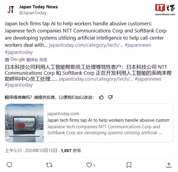 10 月 18 日消息,《今日日本》于 10 月 15 日發布博文,報道稱 NTT 通訊公司和軟銀公司正開發 AI 系統能夠,以幫助客服應對惡劣客戶。在當今社會,