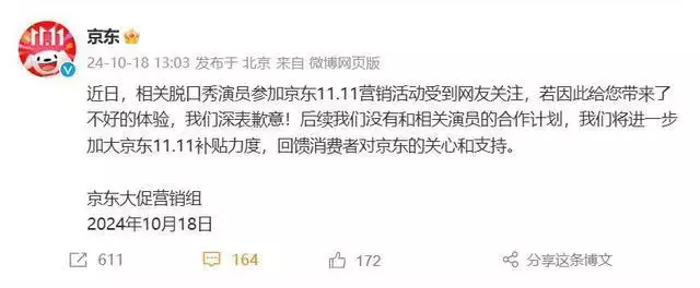 2024 年 10 月 18 日中午,京東大促營銷組發布聲明稱,相關脫口秀演員參加京東 11.11 營銷活動受到網友關注,若給用戶帶來不好體驗,深表歉意,并且后續沒有和相關演員的合作計劃。