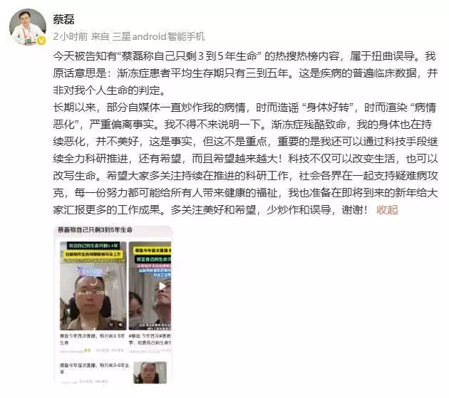 11月26日,京東集團原副總裁、漸凍癥患者蔡磊發文回應“只剩3到5年生命”風聞。 蔡磊表明,
