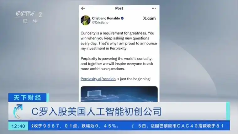 12月6日音訊,據外電報導,億萬富翁足球運動員克里斯蒂亞諾·羅納爾多迄今為止有目共睹的出資是入股了Perplexity AI Inc.,這是一家快速開展的舊金山人工智能(AI)草創公司,