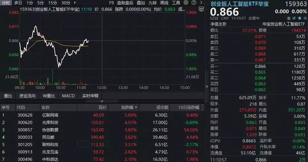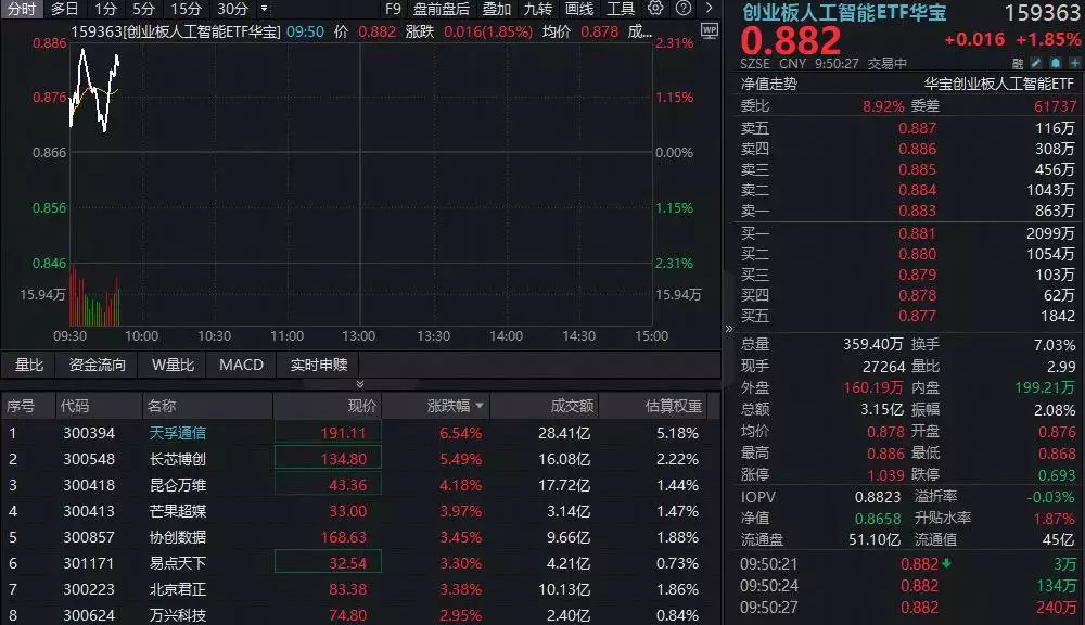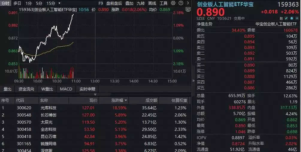 創業板人工智能板塊今天(2025年9月18日)出現了探底回升的走勢,光模塊板塊表現尤為強勁,帶動相關ETF和個股上漲。18日早盤,